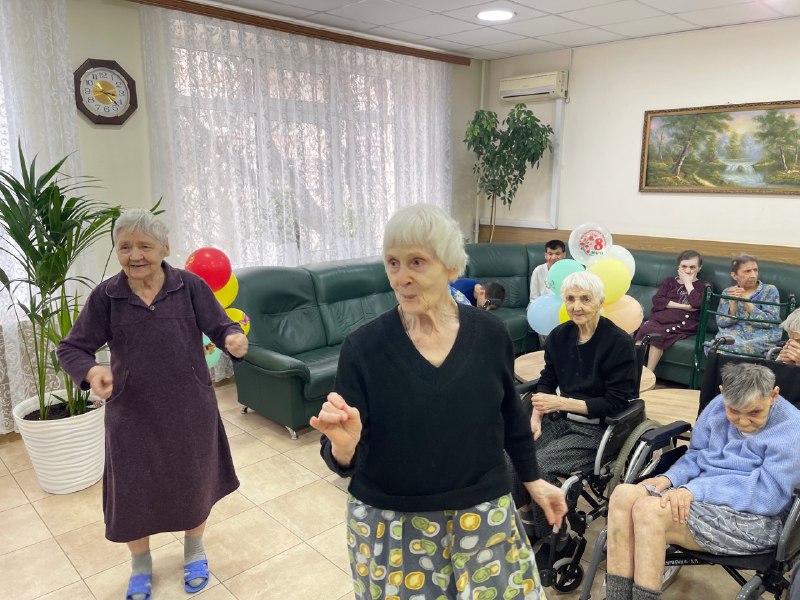 Праздник не ограничился одним концертом. В социальных отделениях прошли душевные мини-концерты. Под живой аккомпанемент баяна наши дорогие дамы уже сами активно подпевали любимым мелодиям. Надо сказать, наши девушки обожают звучание баяна — в такие моменты их радость не знает границ: они поют, танцуют и светятся счастьем.