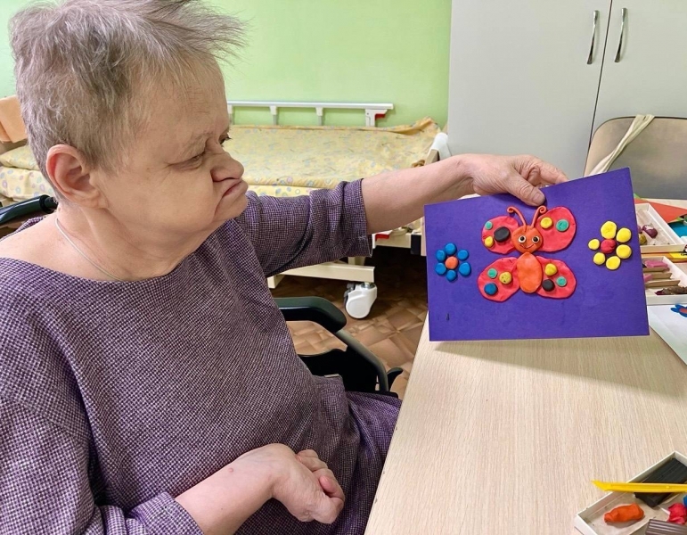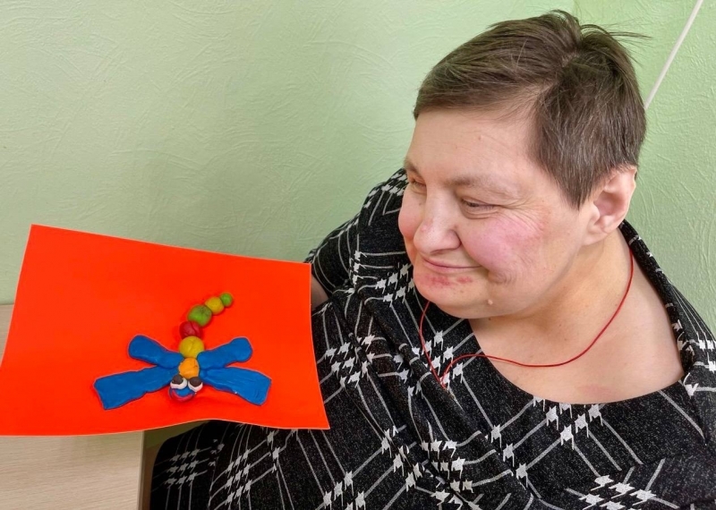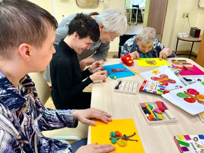 Девушки заняты важным и красивым делом — на наших полянках из пластилина уже распускаются яркие цветы, порхают разноцветные бабочки и стрекозы. Это только кажется, что слепить бабочку просто. Когда у тебя одна рука рабочая, каждый шарик приходится скатывать с особым старанием. Но именно в этом терпении и рождается настоящее мастерство.