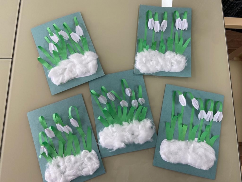 Зима затянулась, на улице еще очень холодно для долгих прогулок, и поэтому мы много занимаемся в арт-студии, мастерим интересные поделки своими руками. На этот раз, девушки, желая приблизить теплую весну, сделали аппликации «Подснежники».