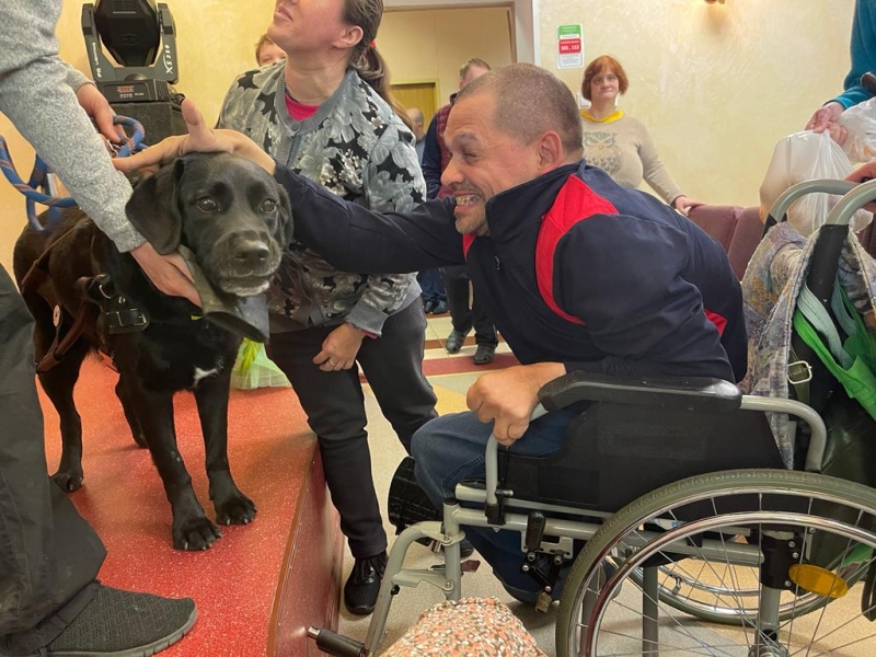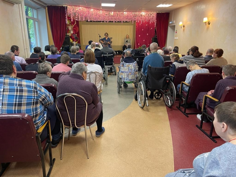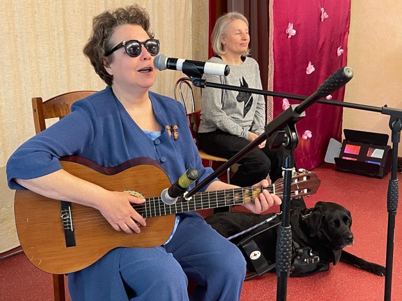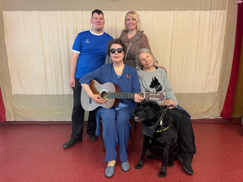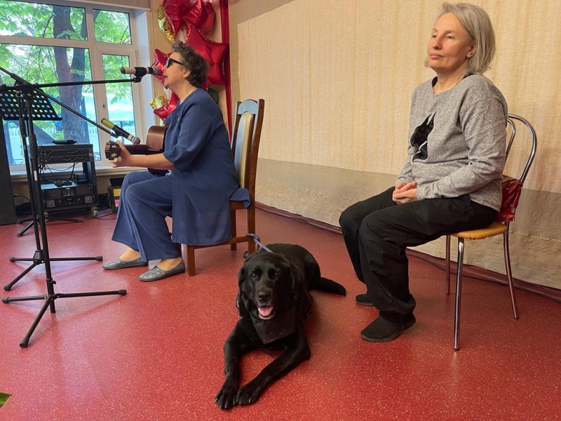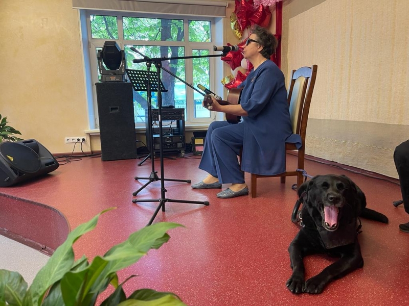 Необыкновенно душевный концерт подарила нашим жителям автор-исполнитель Галина Скоблик. Она приехала сегодня к ребятам в гости в сопровождении собаки-поводыря Глаши. Это специально обученный лабрадор, прошедший школу собак поводырей. Дело в том, что 20 лет назад, в результате неудачной операции на глаза, Галина лишилась зрения, и теперь ее всюду сопровождает верная Глаша, которая помогает добраться до нужного места, избегая препятствий. Глаша не отходит от любимой хозяйки, выполняя все ее команды, и даже может поднять упавшую трость!