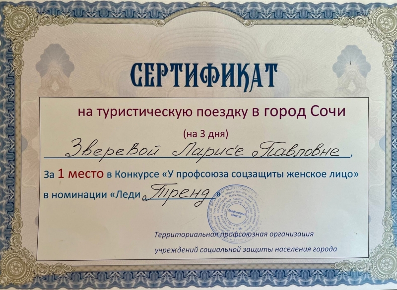 Нашу организацию, Социальный дом «Вешняки», в конкурсе «У Профсоюза соцзащиты женское лицо» представляла Лариса Павловна Зверева. В номинации «Леди Тренд» она заняла 1 место и получила сертификат на туристическую поездку (3 дня) в г. Сочи!