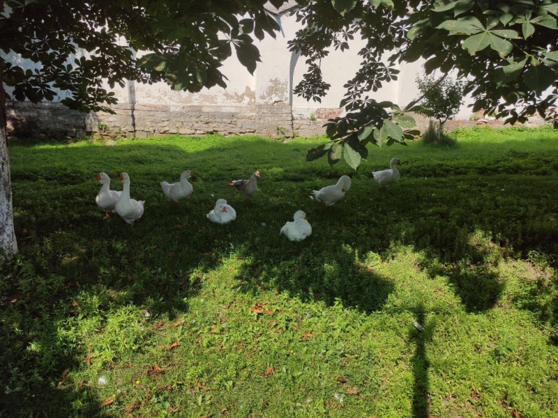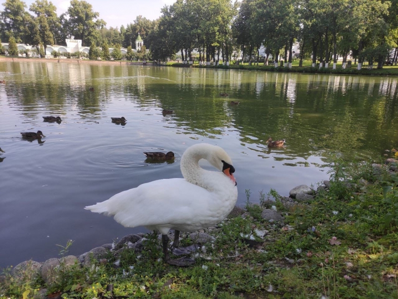 Сразу за воротами открывается прекрасный вид на храмы и пруд. У водоёма всегда оживлённо, много уток, монастырские гуси и даже лебедь, а в деревянном домике, который сделали послушники духовной семинарии живет очаровательное семейство нутрий. Они стали местной достопримечательностью, многие приходят покормить нутрий. Из еды они предпочитают траву и кору деревьев, так как нутрии – вегетарианцы, также обожают лакомиться овощами и фруктами.