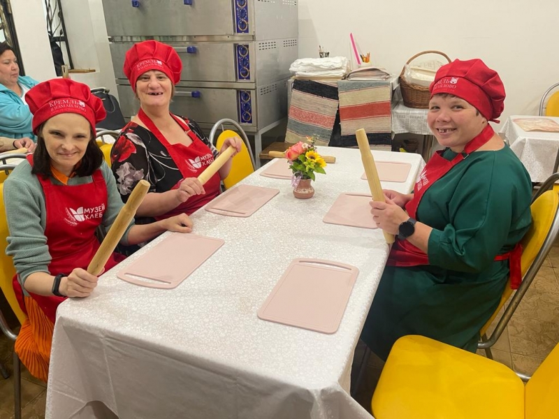 В музее хлеба гостей встретила с караваем хозяйка-умелица, которая научила ребят работать с тестом, формировать его в разнообразные фигуры, создавая пряники. Наши девочки - Оксана, Ярослав и Маша выбрали форму котика, варежки и человечка.