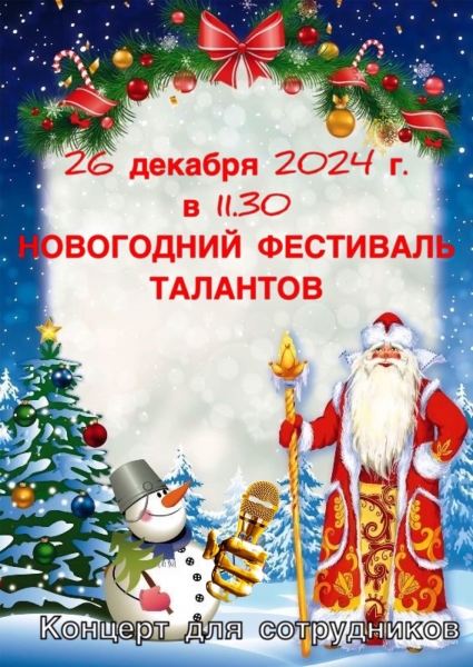 Уважаемые сотрудники Социального дома «Вешняки»! Приглашаем вас 26 декабря 2024 г. на Новогодний концерт, который состоится в 11.30, в актовом зале! Ждем всех!