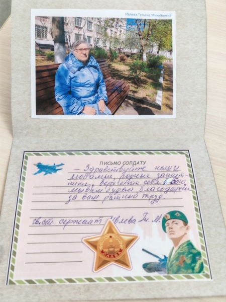 Татьяна Михайловна, прошедшая службу в Советской армии и имеющая звание старшего сержанта, прекрасно понимает, как важна моральная поддержка для наших защитников: «Наши любимые, родные защитники, берегите себя в бою..!». Мы уверены, что эти слова придадут сил тем, кто сейчас находится на передовой.