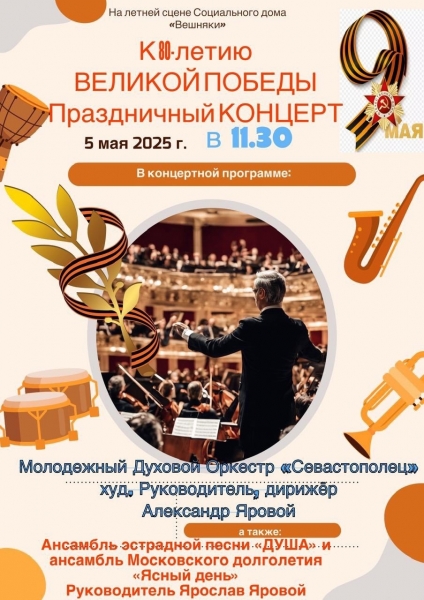 В этом году мы отмечаем 80-летие Великой Победы! Приглашаем вас на Праздничный концерт, который состоится 5 мая 2025 года в 11:30 на летней сцене Социального дома «Вешняки».