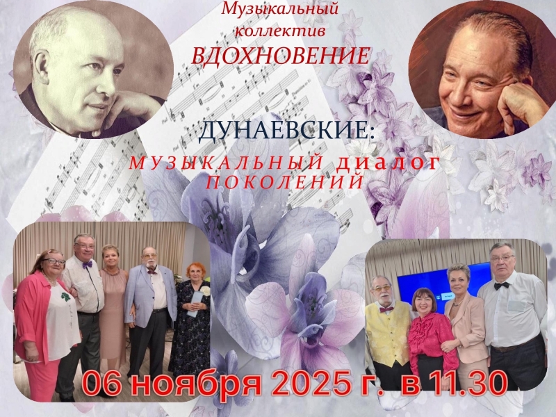 Музыкальный коллектив «Вдохновение» представит уникальную программу, «Дунаевские: музыкальный диалог поколений», посвящённую творческому наследию двух гениальных композиторов — отца и сына Дунаевских. В одном концерте вы услышите как знаменитые мелодии Исаака Дунаевского, ставшие классикой советской музыки, так и знаковые произведения Максима Дунаевского, полюбившиеся уже не одному поколению слушателей.