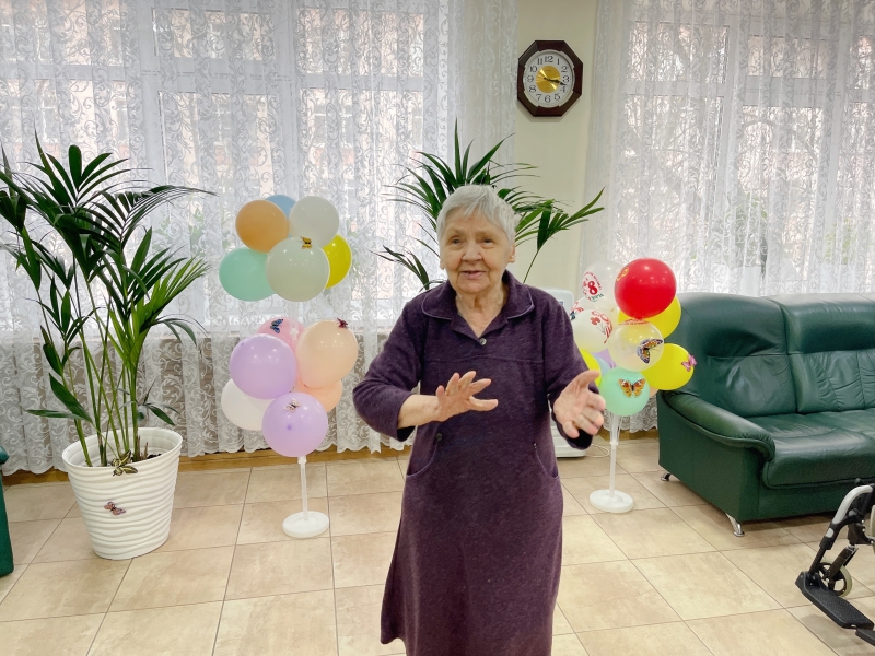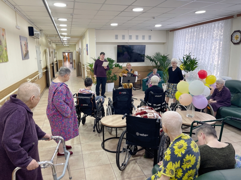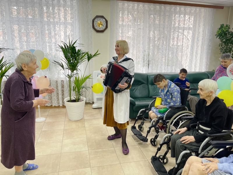 Праздник не ограничился одним концертом. В социальных отделениях прошли душевные мини-концерты. Под живой аккомпанемент баяна наши дорогие дамы уже сами активно подпевали любимым мелодиям. Надо сказать, наши девушки обожают звучание баяна — в такие моменты их радость не знает границ: они поют, танцуют и светятся счастьем.