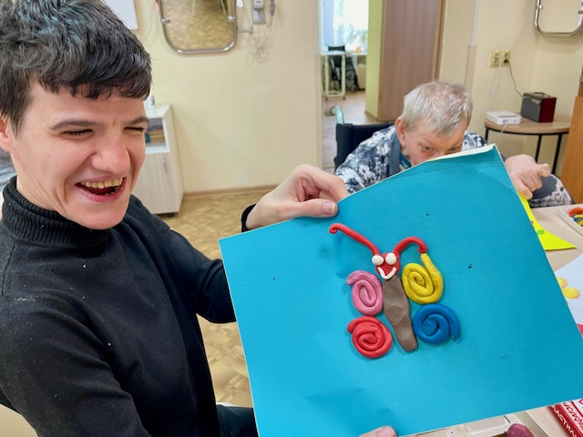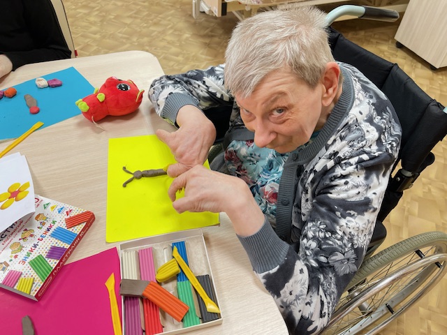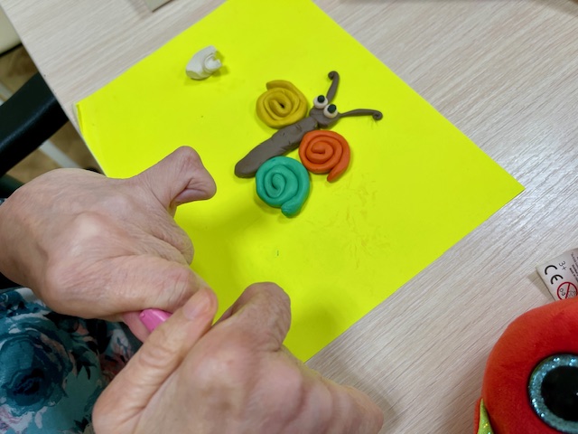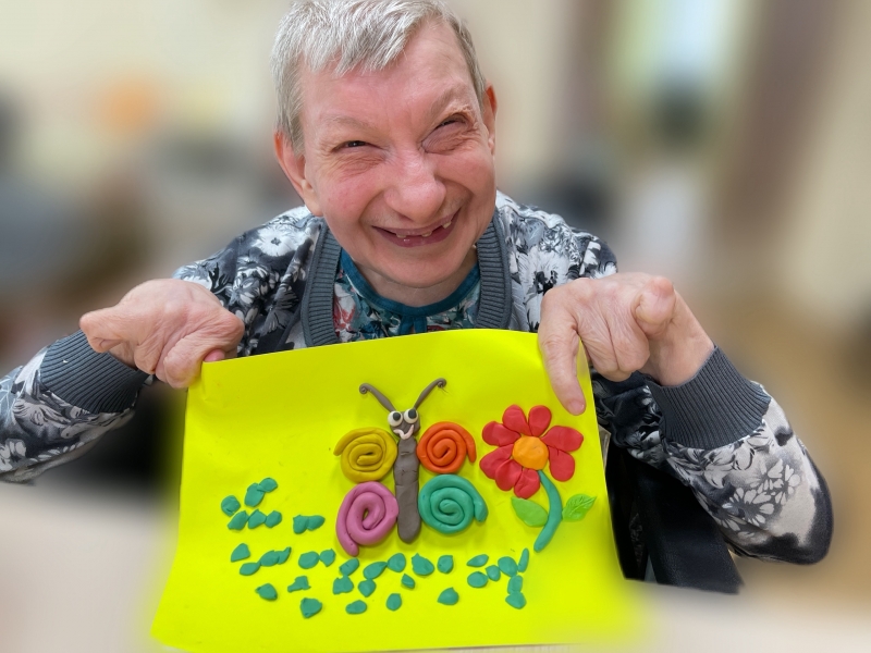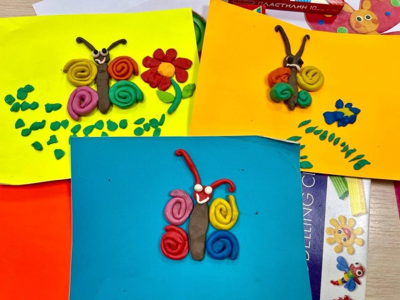 Девушки заняты важным и красивым делом — на наших полянках из пластилина уже распускаются яркие цветы, порхают разноцветные бабочки и стрекозы. Это только кажется, что слепить бабочку просто. Когда у тебя одна рука рабочая, каждый шарик приходится скатывать с особым старанием. Но именно в этом терпении и рождается настоящее мастерство.