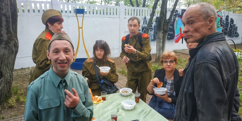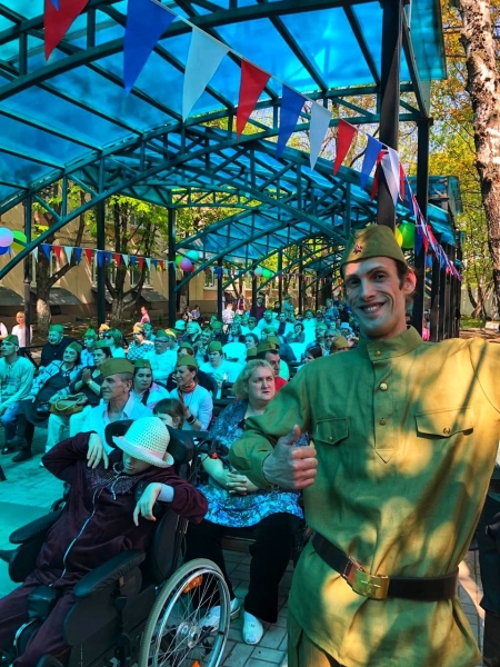 Прозвучали песни военных лет, сопровождавшиеся красивыми танцевальными номерами в исполнении наших проживающих и приглашенных артистов. Гостями праздника были ПНИ г. Москвы. Гости перед концертом активно принимали участия рисовали, лепили, участвовали в конкурсе медсестр. На импровизированной полевой кухне давали настоящую солдатскую кашу.
