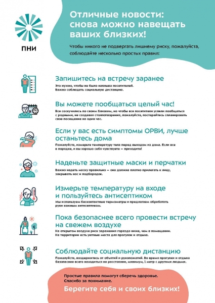 Мы прекращаем вахтовый режим работы и объявляем о возобновлении посещений с «10» августа 2020 года. Нам всем нелегко далось время вынужденной разлуки. Сегодня ситуация стабилизирована. Однако мы вынуждены следовать некоторым ограничениям. Поэтому вводим временные правила посещения, прочитайте их внимательно. Пожалуйста, предупредите нас о своем визите, позвоните по телефону и сообщите дату и время визита.