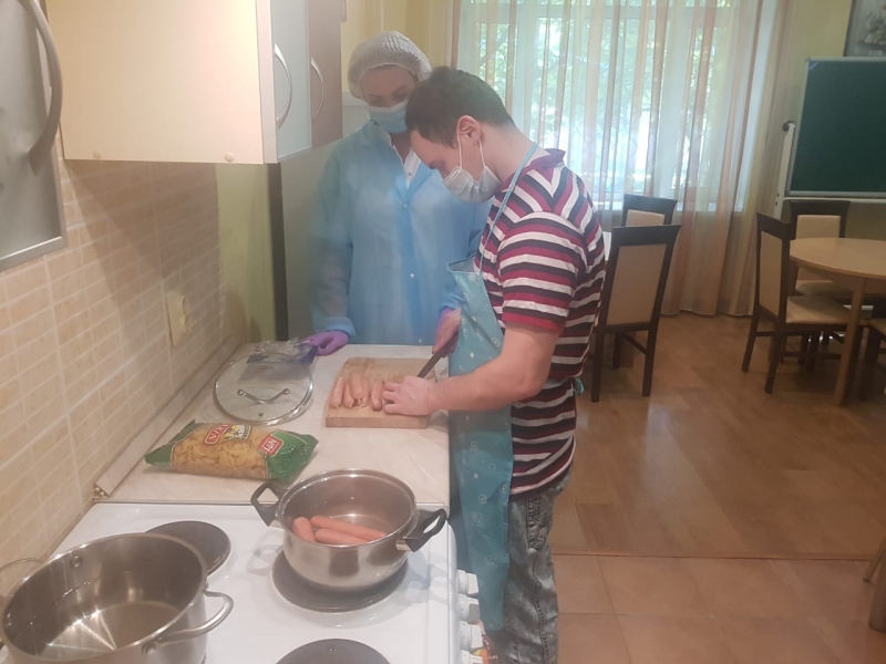 Социально-бытовая комната никогда не пустует. С большим удовольствием проживающие готовят различные блюда русской кухни.