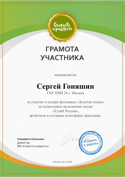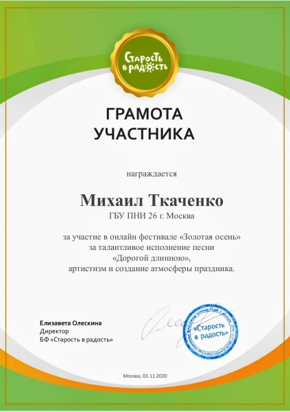 Нашим участникам онлайн фестиваля «Золотая осень» с Андреем Маламаном, были вручены грамоты за талантливое выступление, артистизм и создание атмосферы праздника.