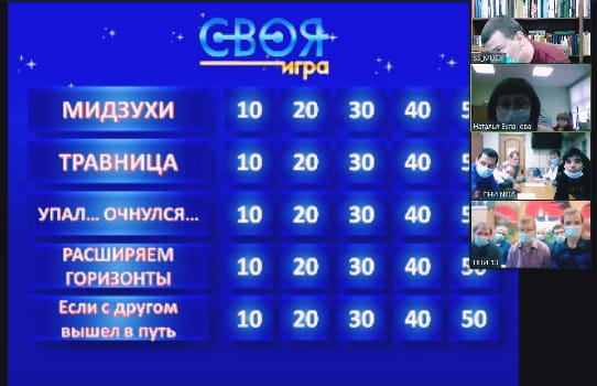 Состоялась онлайн-викторина "Своя игра", организованная ЦССВ "Южное Бутово". В ней приняли участие семь команд. Ребята из ПНИ 11, 13, 16, 26, 30, 34 и ПНИ г. Звенигорода отвечали на вопросы в различных категориях. Например, из листьев какого растения заваривается чай от температуры или какие действия необходимо произвести при переломе. Наш интернат представлял Михаил Ткаченко, набрав 90 баллов. В финал, к сожалению, не вышел, но ведь главное не победа, а участие!