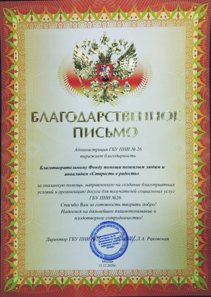 В октябре 2020 года началось активное сотрудничество с благотворительным фондом помощи пожилым людям и инвалидам "Старость в радость". Проект реализуется при поддержке Департамента труда и социальной защиты населения города Москвы. Благодаря фонду "Старость в радость", наши подопечные получили возможность живого общения и активного участия в онлайн-конференциях. Ежедневно проходят интересные встречи, экскурсии, устраиваются различные мастер-классы и концерты, где ребята со всех уголков России имеют возможность раскрыть свои творческие способности. Мы благодарим фонд помощи пожилым людям и инвалидам "Старость в радость" за готовность творить добро, и надеемся на дальнейшее плодотворное сотрудничество!