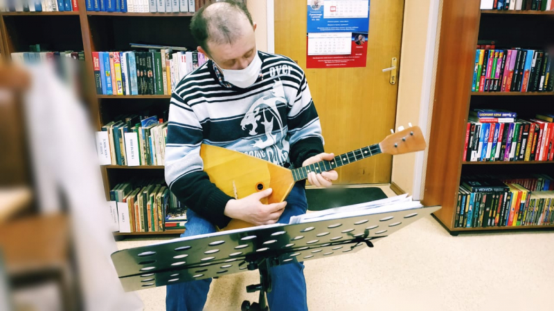 Балалайка – русский народный трёхструнный щипковый музыкальный инструмент с корпусом треугольной формы. Характерными приёмами звукоизвлечения являются бряцание и тремоло – игра указательным пальцем по всем струнам одновременно. Самый известный русский инструмент, ставший наряду с гармонью и гуслями, одним из символов музыкального творчества русского народа. Наш подопечный - Александр Шарохин теперь не только поёт, но ещё и осваивает балалайку, под руководством культорганизатора Л.П.Зверевой: "В детстве Саша посещал музыкальную школу, закончил четыре класса, и это помогает нам сейчас в работе..".