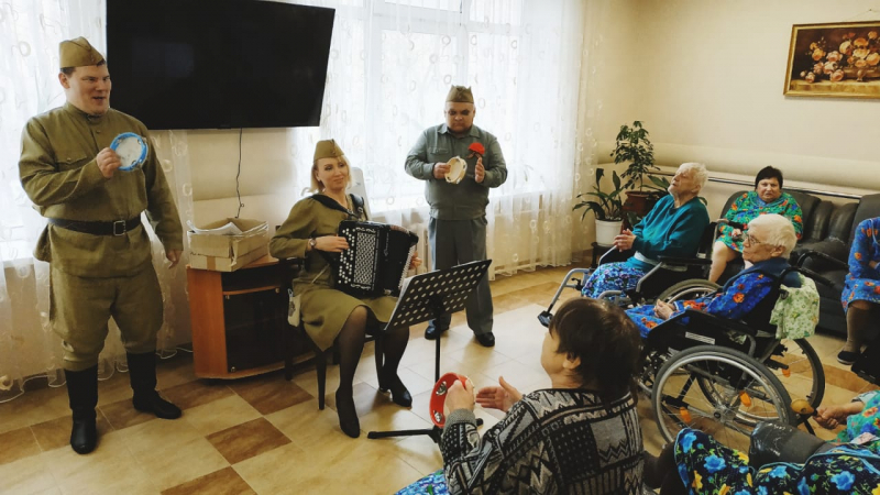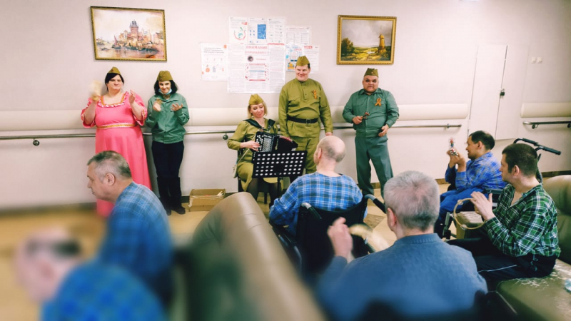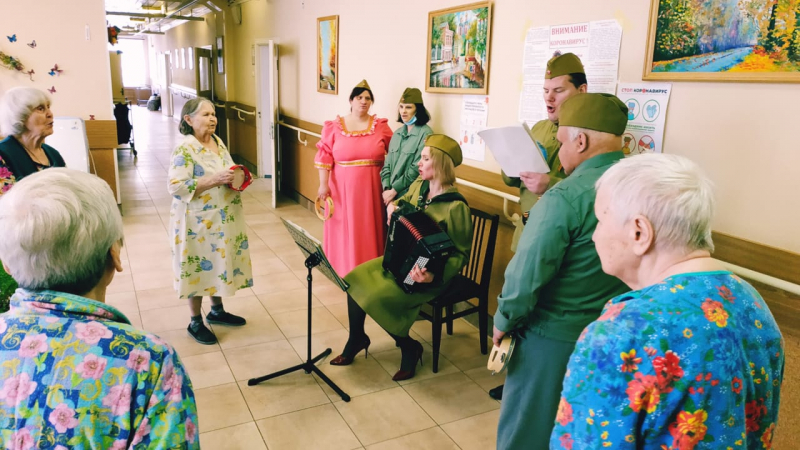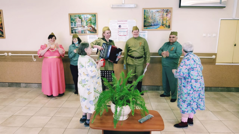 Благодарная память о героических военных годах, бессмертном подвиге славных бойцов и командиров всегда будет объединять нас, служить ярким символом величайшего патриотизма и верности долгу. В преддверии Великой Победы, торжества доблести, мужества, духовного величия народа, и воинской славы Отечества, состоялись праздничные мини-концерты в отделениях милосердия! Мы с удовольствием спели самые известные военные песни: «В лесу прифронтовом», «Катюша», «Огонек», «Синий платочек», «День Победы» и другие, всеми любимые песни военных лет.