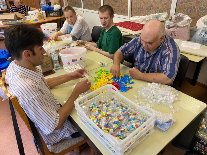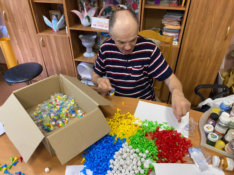 В наше учреждение фонд поставляет материалы (фишки, кубики для настольных игр, элементы для изготовления массажных ковриков), фасовкой которых занимаются наши подопечные, а также изготовлением массажных ковриков. Ребята, таким образом, вовлечены в трудовую деятельность. Разрабатывая мелкую моторику рук, вырабатывая усидчивость, ещё и получат оплату за свой труд!