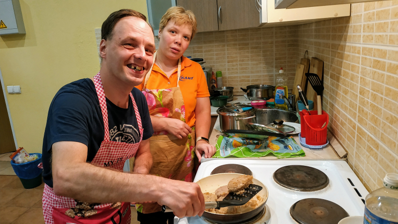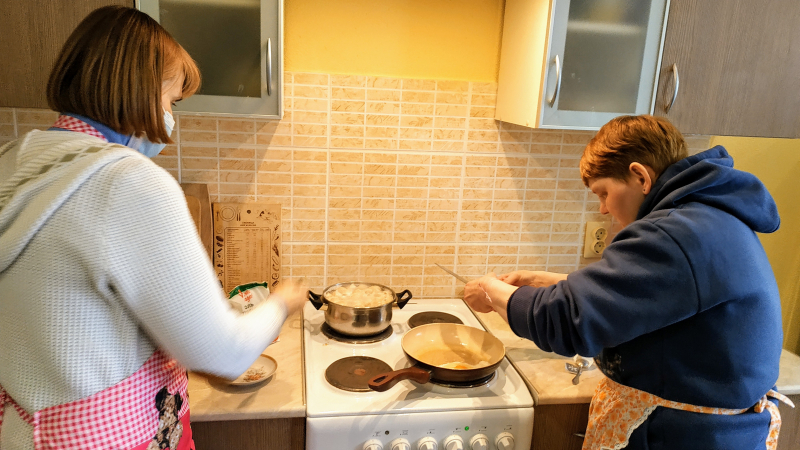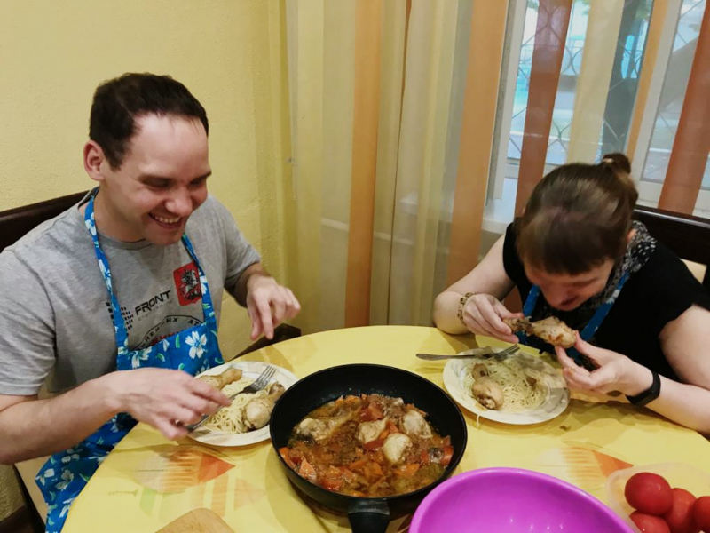 Сережа, под чутким и строгим руководством Маши, пожарил котлеты, Вася с Ирой приготовили и с удовольствием уплетают тушеную курицу, а Марина сварила пельмени.