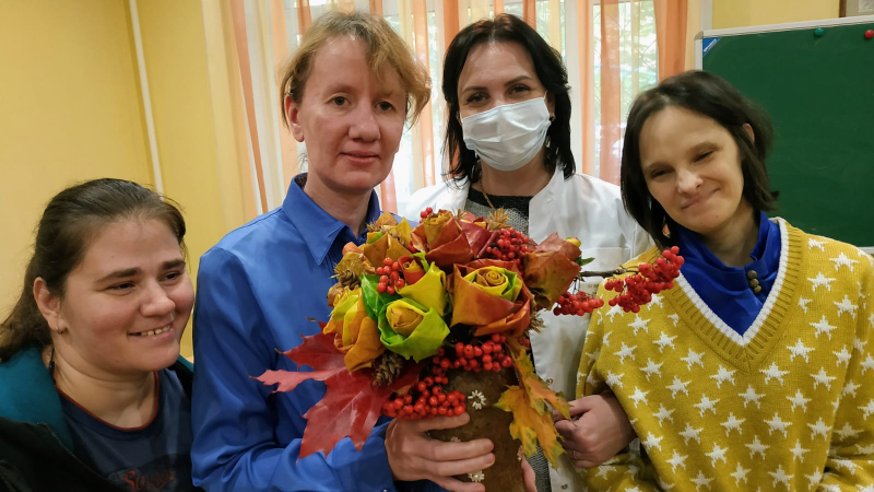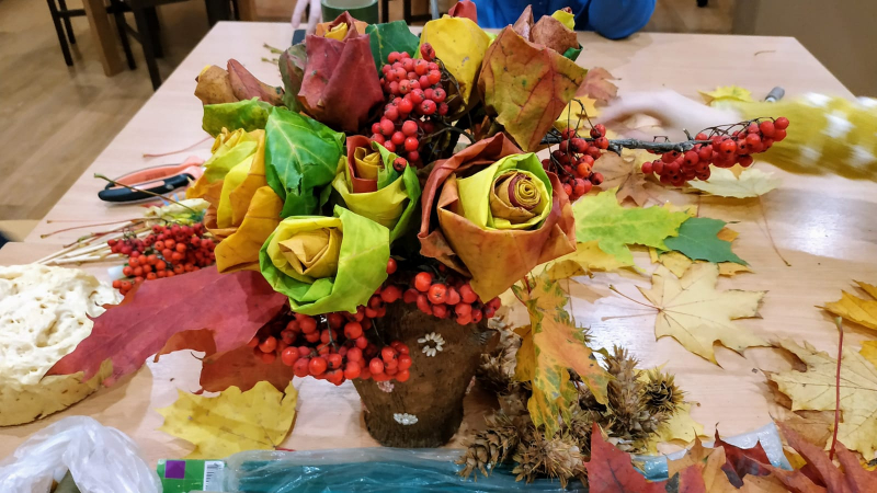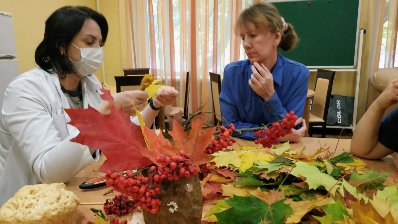 Осенние листья, красные, желтые, еще где-то даже пока зеленые, яркие рябиновые кисти – настоящие материалы для творчества. Пользуясь дарами осени, наши рукодельницы, под руководством специалиста по реабилитации Зиминой Е.С, создали необыкновенно красивый осенний букет.