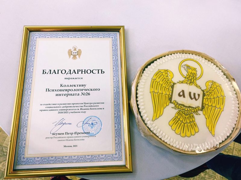 На торжественном мероприятии, где чествовались лучшие преподаватели, студенты и партнёры, наш коллектив представили Зверева Л.П. и Положенцев К.В. Благодарность коллективу ГБУ ПНИ 26, за содействие в развитии проектов Центра развития социального добровольчества Российского православного университета св. Иоанна Богослова, будет достойно украшать стены нашего учреждения.