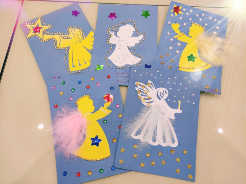 Совсем недавно мы отпраздновали Рождество Христово, и сегодня ребята сделали своими руками аппликации Ангелочков, символизирующих того самого Ангела, который возвестил Деве Марии, что она избирается в Матери самого Бога.