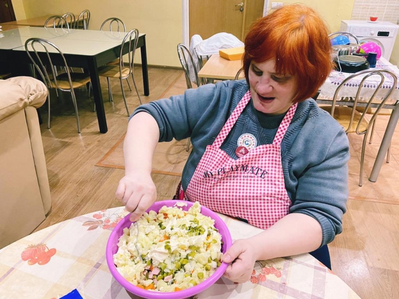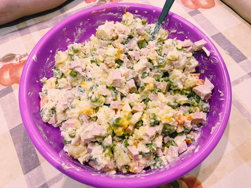 Хорошие хозяйки стараются порезать все продукты маленькими кубиками. И наши хозяюшки, Ярослава и Оксана, постарались, и приготовили вкуснейший салат Оливье. Приятного аппетита!